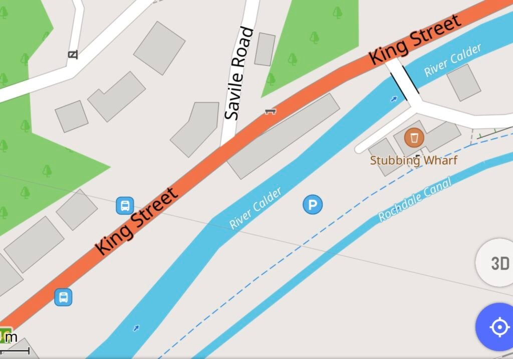 To reach the start of the walk, take a 591 from Todmorden towards Halifax at 09:54 and get off at the Green Springs stop, which is shortly after you’ve gone under a railway bridge. From the other direction, the 590 leaving Halifax at 09:31 passes Mytholmroyd at 09:56 and Hebden Bridge at 10:02. Get off at the stop after passing the Stubbing Wharf pub. [The attached map extract shows the location of the Savile Road junction, where the walk starts, relative to the Stubbing Wharf and the bus stops in each direction]. You can also get close on the 596, which you should alight after the turning circle.