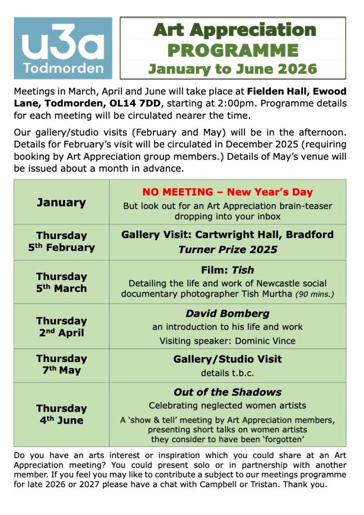 | When: | Monthly on Thursday afternoons The group meets on the first Thursday in the month 2-4pm at the Fielden Centre except every third month when a trip to a gallery or an artist’s studio is arranged |